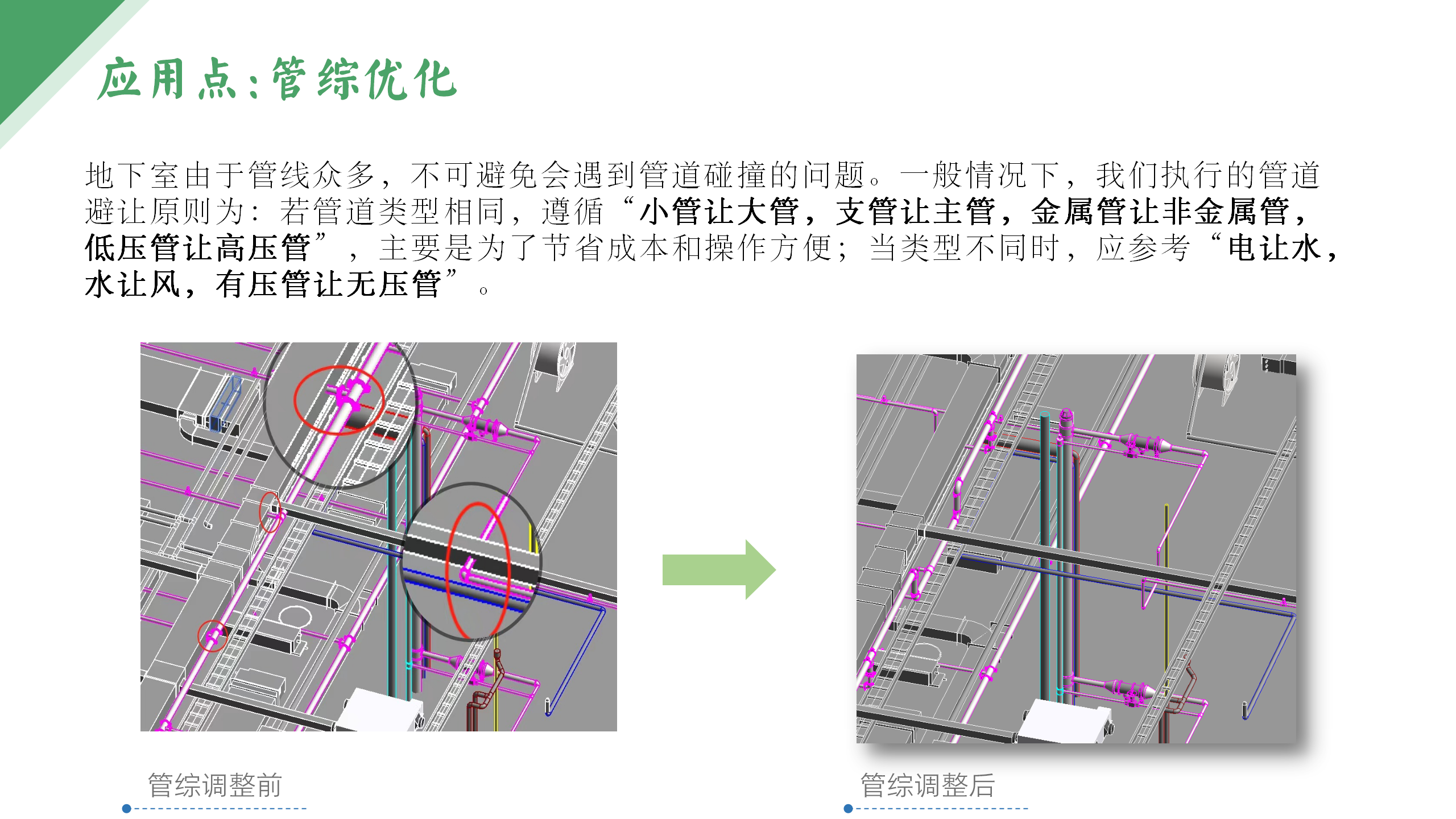 应用点:管综优化 由于管线众多,不可避免会遇到管道碰撞的问题。一般情况下,我们执行的管道避让原则为:若管道类型相同,遵循“小管让大管,支管让主管,金属管让非金属管,低压管让高压管”,主要是为了节省成本和操作方便;当类型不同时,应参考“电让水,水让风,有压管让无压管”。