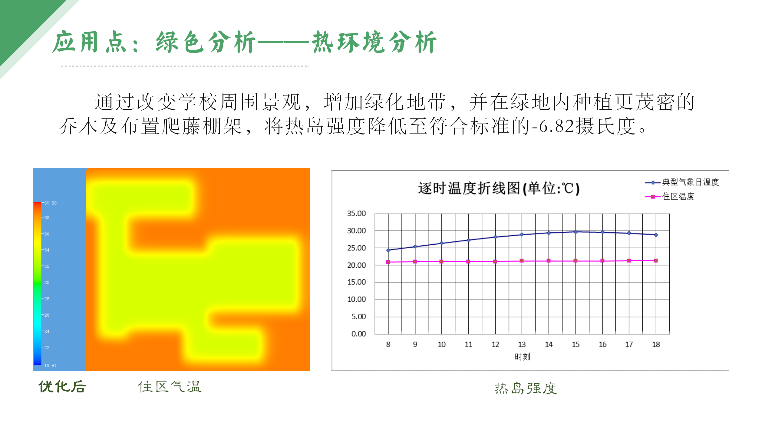 应用点:绿色分析——热环境分析 改造前学校周围绿化地带较少,乔木稀疏,平均热岛强度也因此偏高,达到4.57摄氏度,该值远远超于标准要求的1.5摄氏度。 通过改变学校周围景观,增加绿化地带,并在绿地内种植更茂密的乔木及布置爬藤棚架,将热岛强度降低至符合标准的-6.82摄氏度。