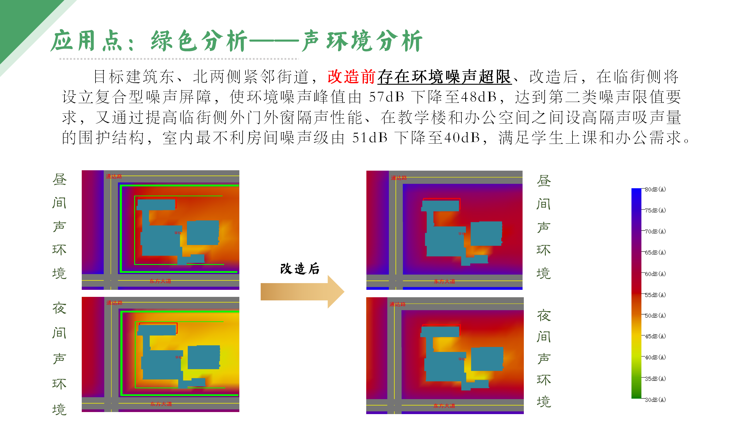 应用点:绿色分析—声环境分析 目标建筑东、北两侧紧邻街道,改造前存在环境噪声超限、改造后,在临街侧将设立复合型噪声屏障,使环境噪声峰值由 57dB 下降至48dB,达到第二类噪声限值要求,又通过提高临街侧外门外窗隔声性能、在教学楼和办公空间之间设高隔声吸声量的围护结构,室内最不利房间噪声级由 51dB 下降至40dB,满足学生上课和办公需求。