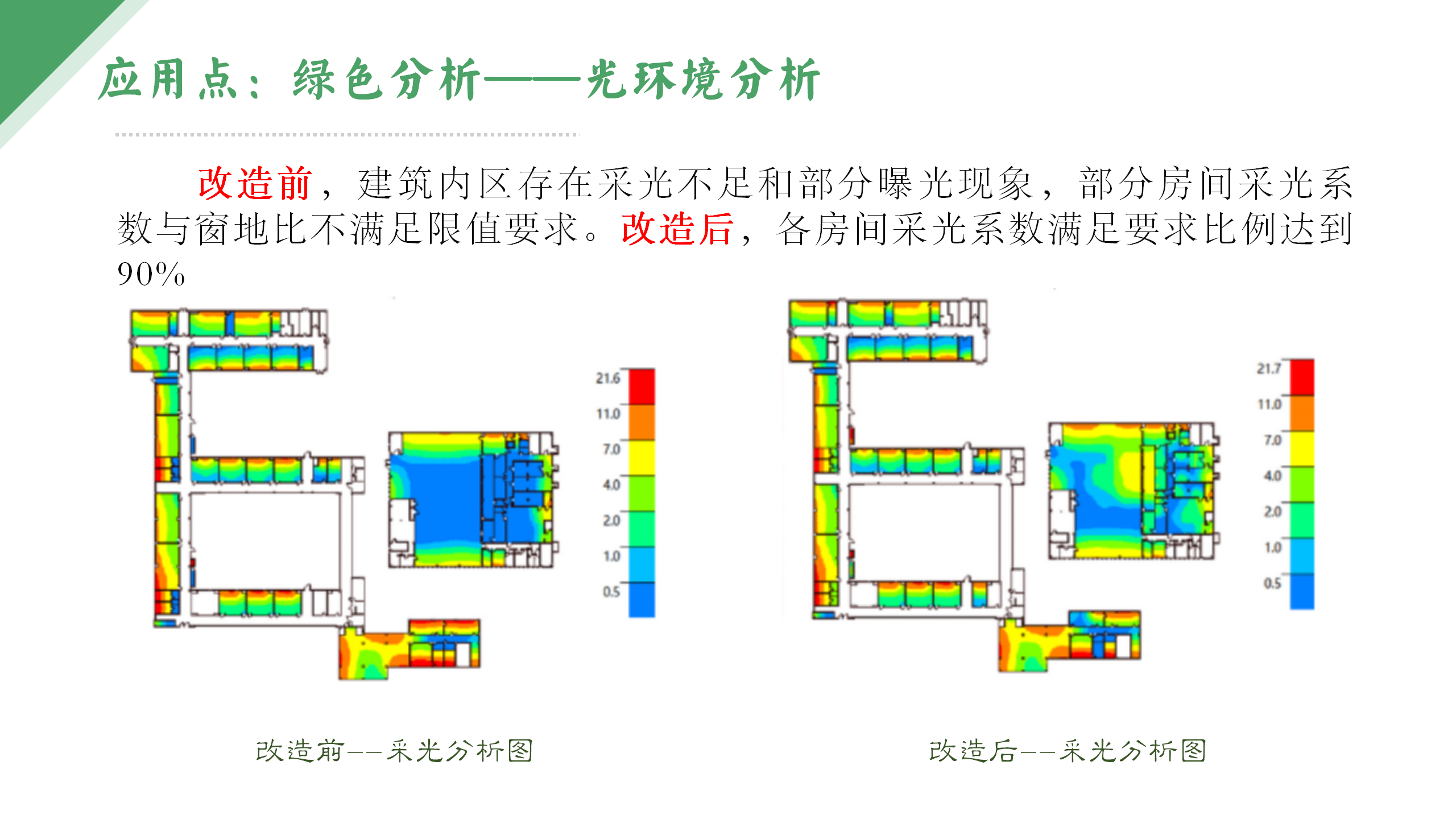 应用点:绿色分析——光环境分析 改造前,建筑内区存在采光不足和部分曝光现象,部分房间采光系数与窗地比不满足限值要求。改造后,各房间采光系数满足要求比例达到90%