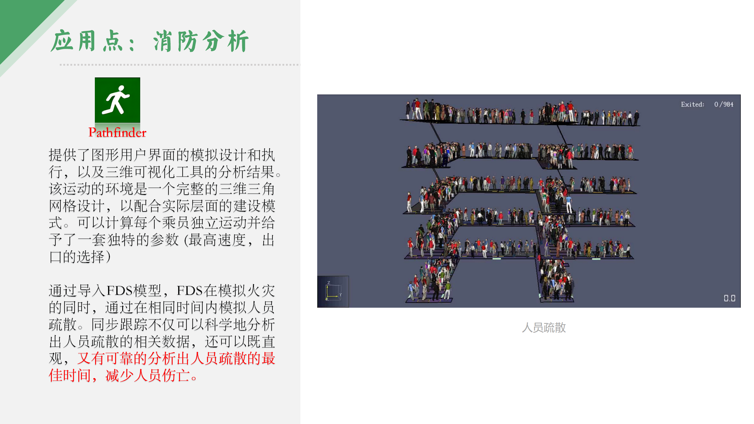应用点:消防分析——Pathfinder 通过导入FDS模型,FDS在模拟火灾的同时,通过在相同时间内模拟人员疏散。同步跟踪不仅可以科学地分析出人员疏散的相关数据,还可以既直观,又有可靠的分析出人员疏散的最佳时间,减少人员伤亡。